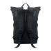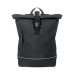 15 inch roll top laptop backpack in soft PU with padded back and base reinforcement with reflective strip. Waterproof zippered front pocket. 210D RPET polyester lining.