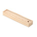 12 pieces stationery set with 2 pencils, 6 colouring pencils, 1 sharpener, 1 eraser and ruler incorporated in the lid of the wooden box.