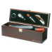 Wine set in wooden gift box with space for one wine bottle. Includes bottle collar, pourer, stopper, and corkscrew. Wine bottle not included.