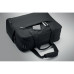 Carry-on hand luggage travel bag in 600D RPET with large zippered front pocket, two small side pockets. Includes 15 inch laptop compartment. Padded removable and adjustable shoulder strap. Trolley holder on reverse side.