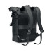 Rolltop backpack in 50C tarpaulin with padded back, base and shoulder straps reinforcement. Front zippered pockets.