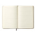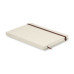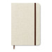 A5 notebook with hard canvas cover. Casebound. 192 lined recycled paper pages (96 sheets). Contrasting elastic closure strap and ribbon page-marker.