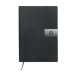 A5 PU notebook with soft cover. Casebound. 160 lined recycled paper pages (80 sheets). Matching elastic band and ribbon bookmark. Metal detail on the front.