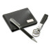 Elegant gift set presented on an EVA tray and carton box. Includes a twist ball pen with blue ink refill, a metal key ring with PU loop and a PU wallet. All PU finish with contrasted stitching....