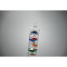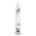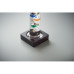 Galileo thermometer in glass with five coloured floating globes and wooden base. Each globe indicates the temperature from 18°c to 26°: Red 26°, Royal Blue 24°, Orange 22°, Green 20°and Purple 18°. The lowest sphere in the top group indicates ambient temperature.