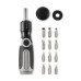 Bendable screwdriver set with ABS handle and 12 iron bits including Phillips, flat head, hex and torx types.