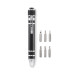 Recycled aluminium multi tool in pen shape with torch. Includes 3 slotted and 3 Phillips screwdriver heads. 4 button cell LR41 batteries included.