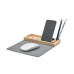 Wireless charger and desk organizer in bamboo with phone stand, 3 pen holders and foldable RPET mouse mat. Output: DC 9V/1.67A (15W).