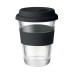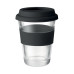 Glass tumbler with silicone lid and grip. Capacity 350 ml. As this is a single wall mug heat transfer can still occur.